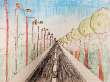 En 3ème, on réamorce le projet en représentant des champs de fleurs en peinture ou une maison hantée au bout d’un chemin lugubre, très lugubre… : La maison hantée au bout du chemin