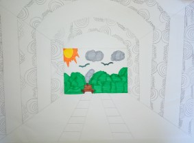Lors de la première séance, je suis ce que le Zil propose : petite « dictée croquis », observation des réalisations et mise en évidence de la difficulté à représenter la profondeur, observation de tableaux et introduction du vocabulaire spécifique (point de fuite, ligne de fuite, ligne d’horizon).