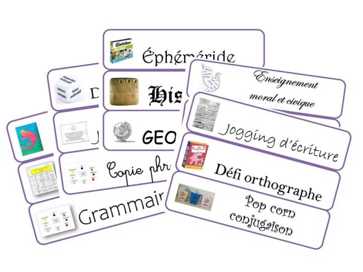 Pour éviter de répondre 16 fois à la question « Quel cahier faut-il prendre aujourd’hui ? » ou encore « On fait Histoire ou géo ? » (les cahiers restent en classe le plus souvent), je viens de créer des petites étiquettes pour afficher le programme de la séance. Je suis d’autant plus motivée que j’ai trouvé du scotch aimanté pour aller avec.