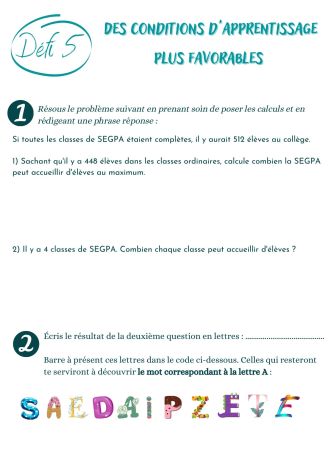 Les élèves devront résoudre un problème qui leur permettra de retrouver quel est l’effectif maximum des classes de Segpa (16). Ensuite, en suivant un sorte de cryptogramme, ils retrouveront le mot « ADAPTÉ« .