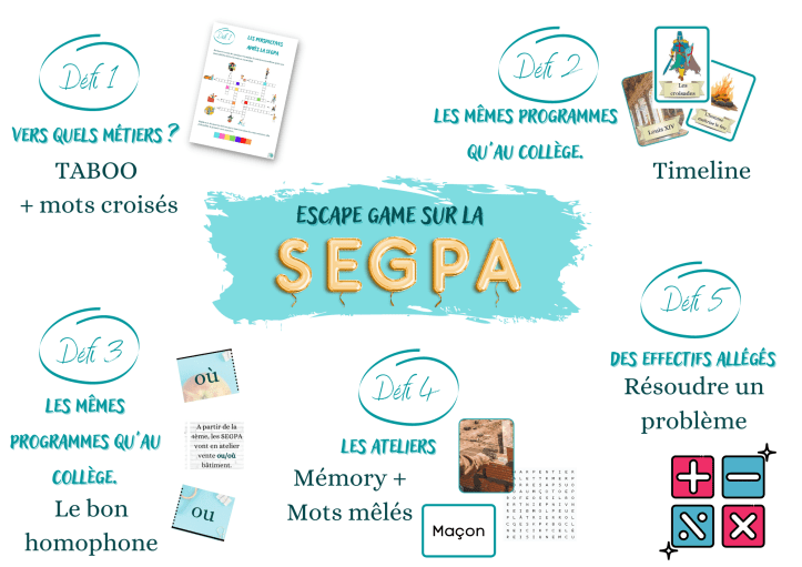 Voici comment je pensais procéder : les élèves auraient été répartis en équipes et auraient dû résoudre 5 énigmes afin de retrouver les mots qui correspondent au sigle SEGPA.