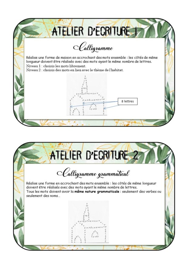 Et voici d’autres ateliers d’écriture que les élèves peuvent utiliser en autonomie lors d’un plan de travail par exemple :
