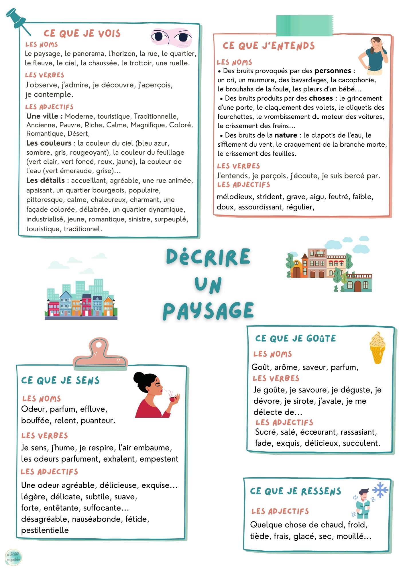 Voici une petite fiche de vocabulaire que j’ai créée pour aider mes élèves à décrire un paysage (dans un récit de voyage par exemple) : Décrire un paysage