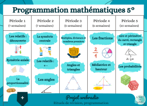 Jusqu’ici, je ciblais les domaines à reprendre et ceux qui pouvaient être découverts. Je travaille par thèmes en différenciant au moment des exercices. Voici les progressions mises en place il y a quelques années : Progression maths 6ème Progression maths 5° Progression maths 4° Progression maths 3° Je dirais qu’il s’agit de la version « raisonnable » avec beaucoup de cycle 3 et un peu de cycle 4. Elles correspondaient à ce qui était attendu à l’époque, à savoir viser le CFG, le DNB étant réservé aux meilleurs.