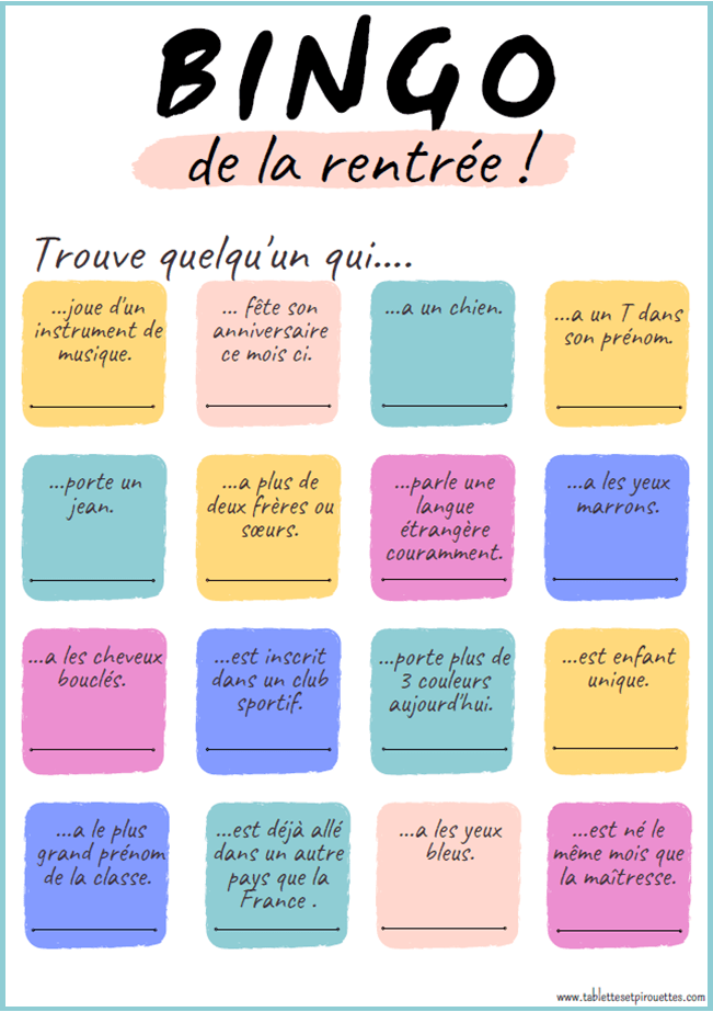 On pourra utiliser par exemple le bingo de Tablettes et pirouettes.